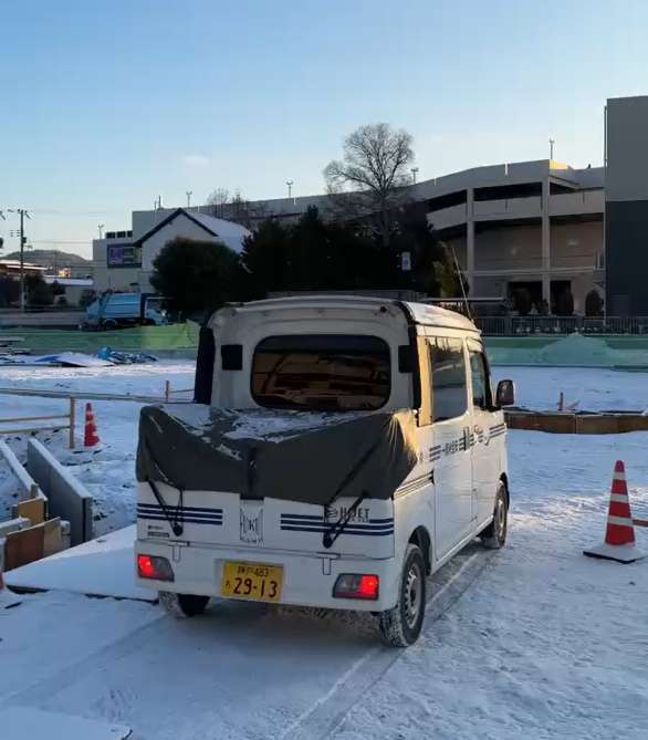 トラックや資材も真っ白になるほどの冷え込みでしたが、安全確認を徹底しながら通常通り作業を行いました。